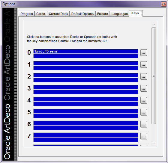 Ten Decks and ten Spreads can be associated with Ctrl + Alt Keys 0-9 so that they can be quickly launched using the shortcut.
